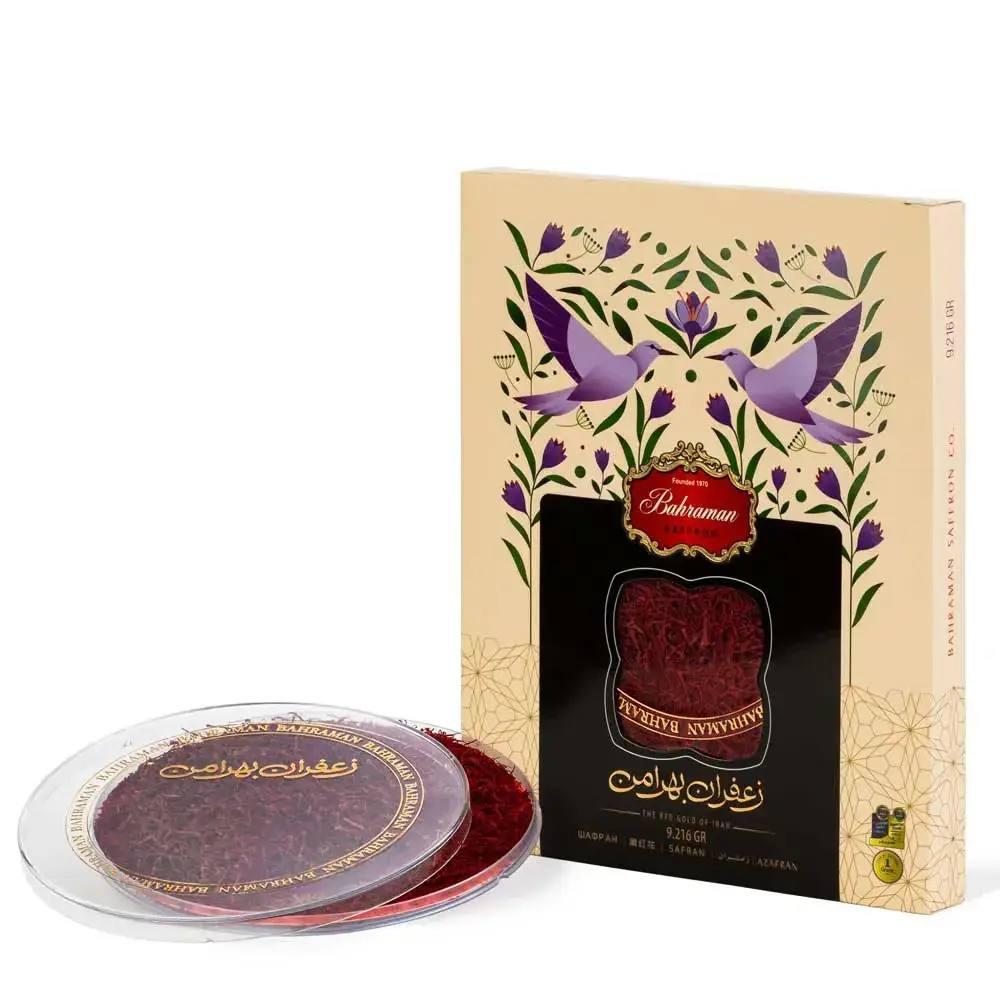 Ghoti presentation with visible saffron stigmas in a clear-dish sleeve.